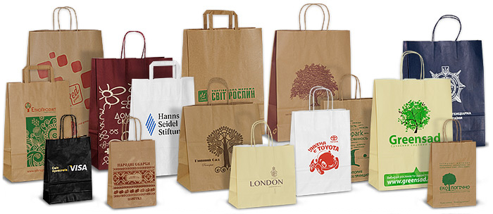 Пакеты из стильной коричневой (натурального древесного цвета), белой или окрашенной в определённый цвет крафт-бумаги с кручеными бумажными ручками или верёвочными. Возможно нанесение до 2-х цветов. Изготавливаются методом шелкографии. Срок изготовления — от 3 дней.
